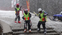 Rano słonecznie, a od popołudnia zachmurzyło się i dzięki temu nie było aż tak gorąco. Po przerwie tylko kilka razy grupy wjechały kanapami na górę. Potem wszyscy przenieśli się na polanę koło talerzyka (tu jeszcze warunki śniegowe były niezłe) gdzie śmigali między kijkami narciarskimi trenując przed jutrzejszymi zawodami.